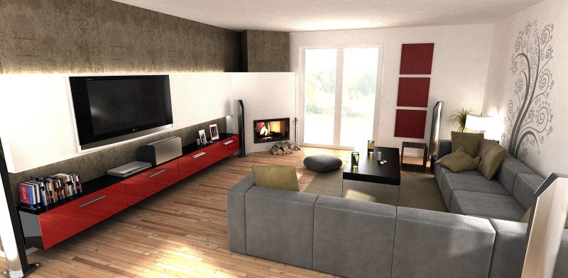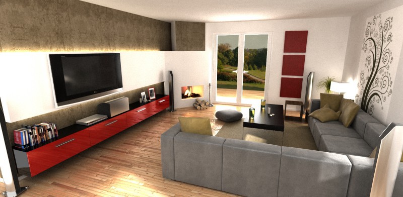 Projekt, wizualizacja 3d salonu w domu jednorodzinnym. Wizualizacja projektu wnętrza została wykonana w kilku wariantach.