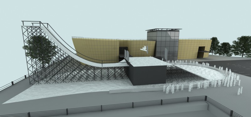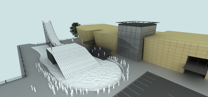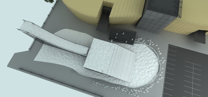 Wizualizacja poglądowa 3d projektu rampy dla pokazów snowboardowych które mialy się odbywać przy Gemini Parku w Bielsku-Białej.