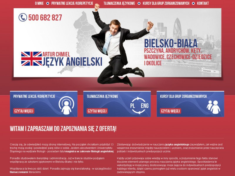 Na bazie naszego autorskiego systemu CMS stworzyliśmy stronę www dla nauczyciela, korepetytora i tłumacza języka angielskiego. Strona w sposób prosty i przejrzysty przedstawia ofertę i dokonania.