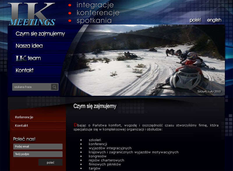 Dla Klienta zajmującego się kompleksową organizacją i obsługą szkoleń, konferencji i wyjazdów integracyjnych stworzyliśmy stronę www w oparciu o nasz autorski system CMS w wersjach językowych polskiej i angielskiej.